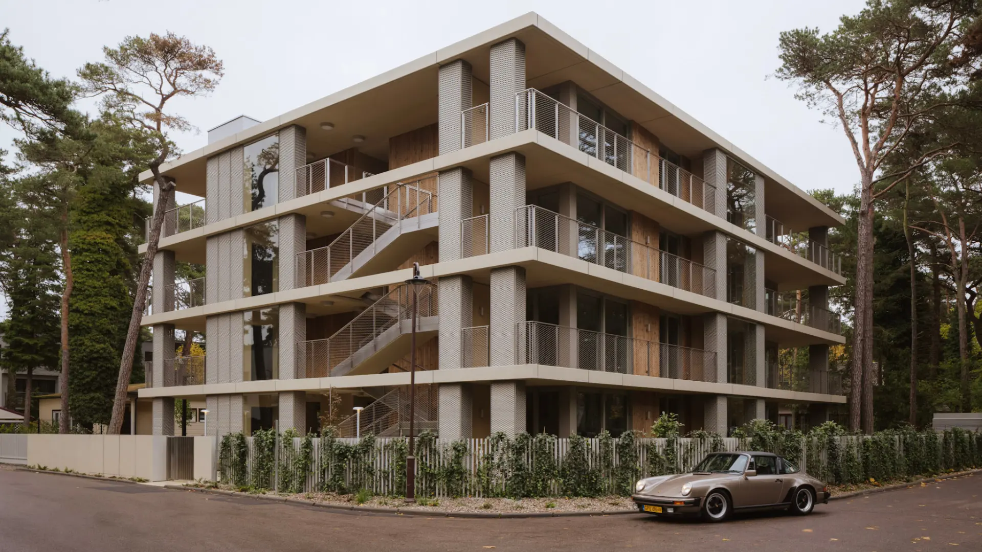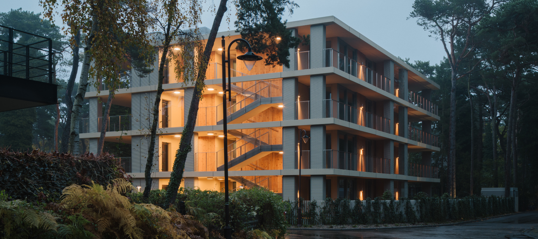 Elewacja opiera się na dialogu materiałów: drewna, stali i szkła. Nowoczesna bryła nie dominuje otoczenia, lecz porządkuje przestrzeń i zapewnia realną prywatność każdemu apartamentowi.