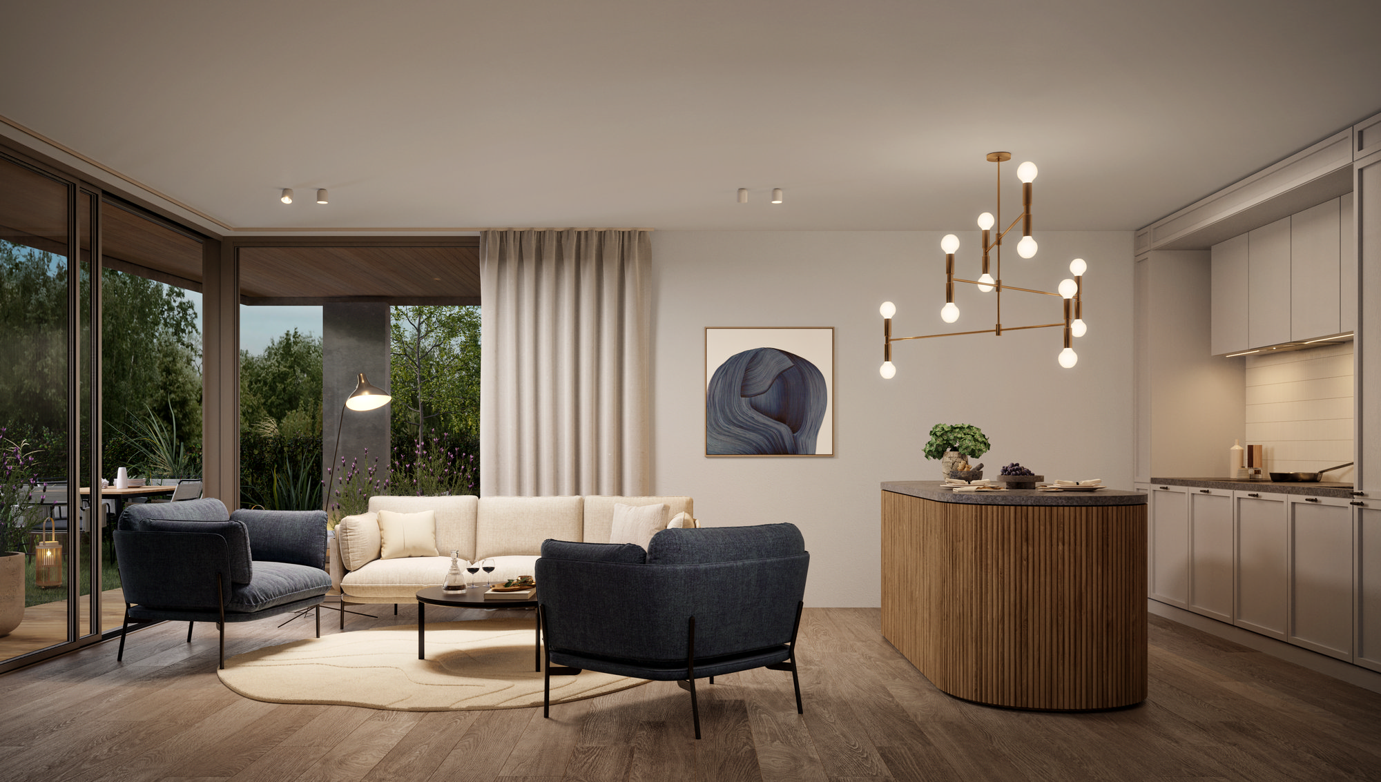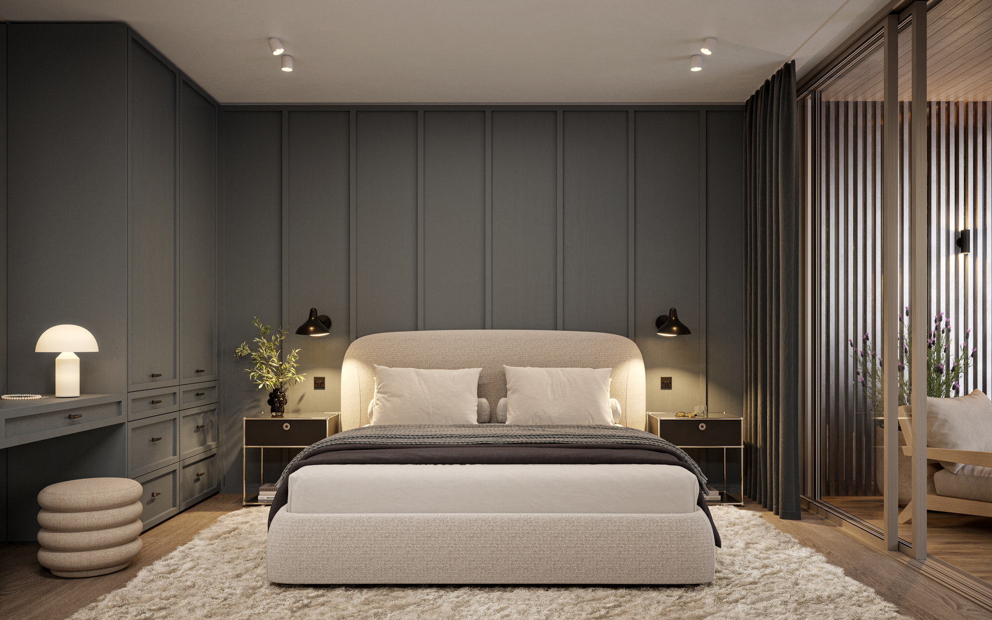 Estetyka aranżacji bazuje na szlachetnych odcieniach szarości przeplatających się z ciemnymi tonacjami błękitu, które wprowadzają do wnętrza aurę spokoju. Subtelna zmysłowość.