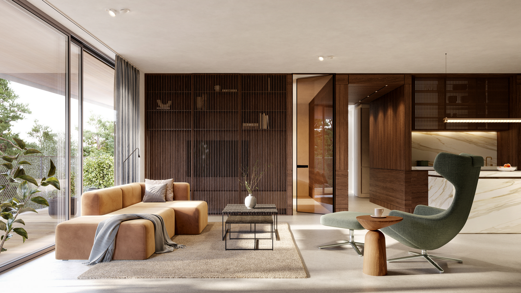 Obydwa materiały nadają aranżacji poczucie ukojenia i głębi. Prostolinijne bryły korespondują z miękkimi formami wyposażenia. Delikatne, metalowe stoliki obok welurowej, koniakowej sofy, jasne marmurowe blaty z zielono-złotymi żyłami, mosiężna armatura. Komfortowo i elegancko. Wnętrze manifestuje klasyczne zestawienia i ponadczasowość designu. Światło i pejzaż. Szaro-zielone odcienie dominujące w dodatkach odzwierciedlają morską paletę barw.