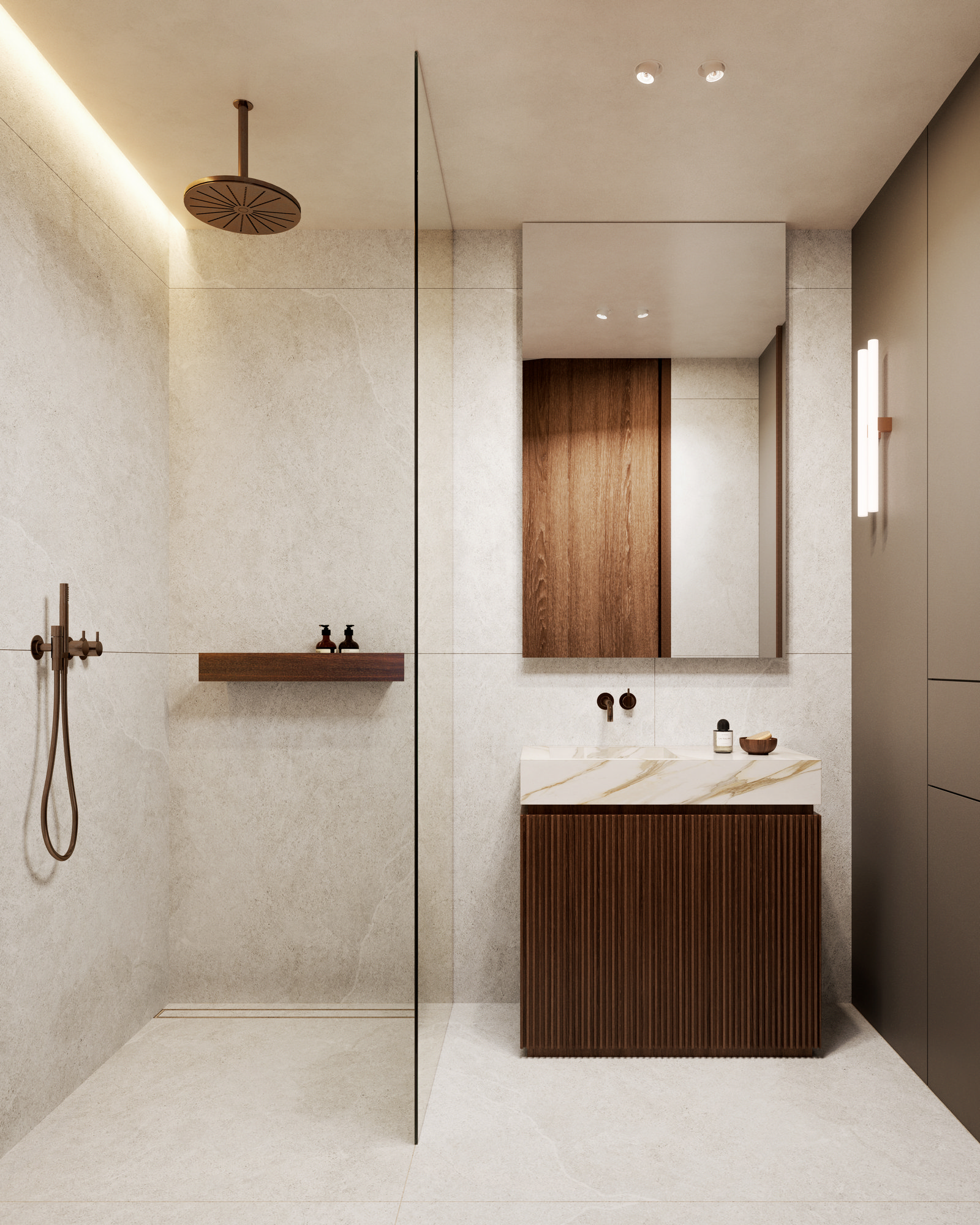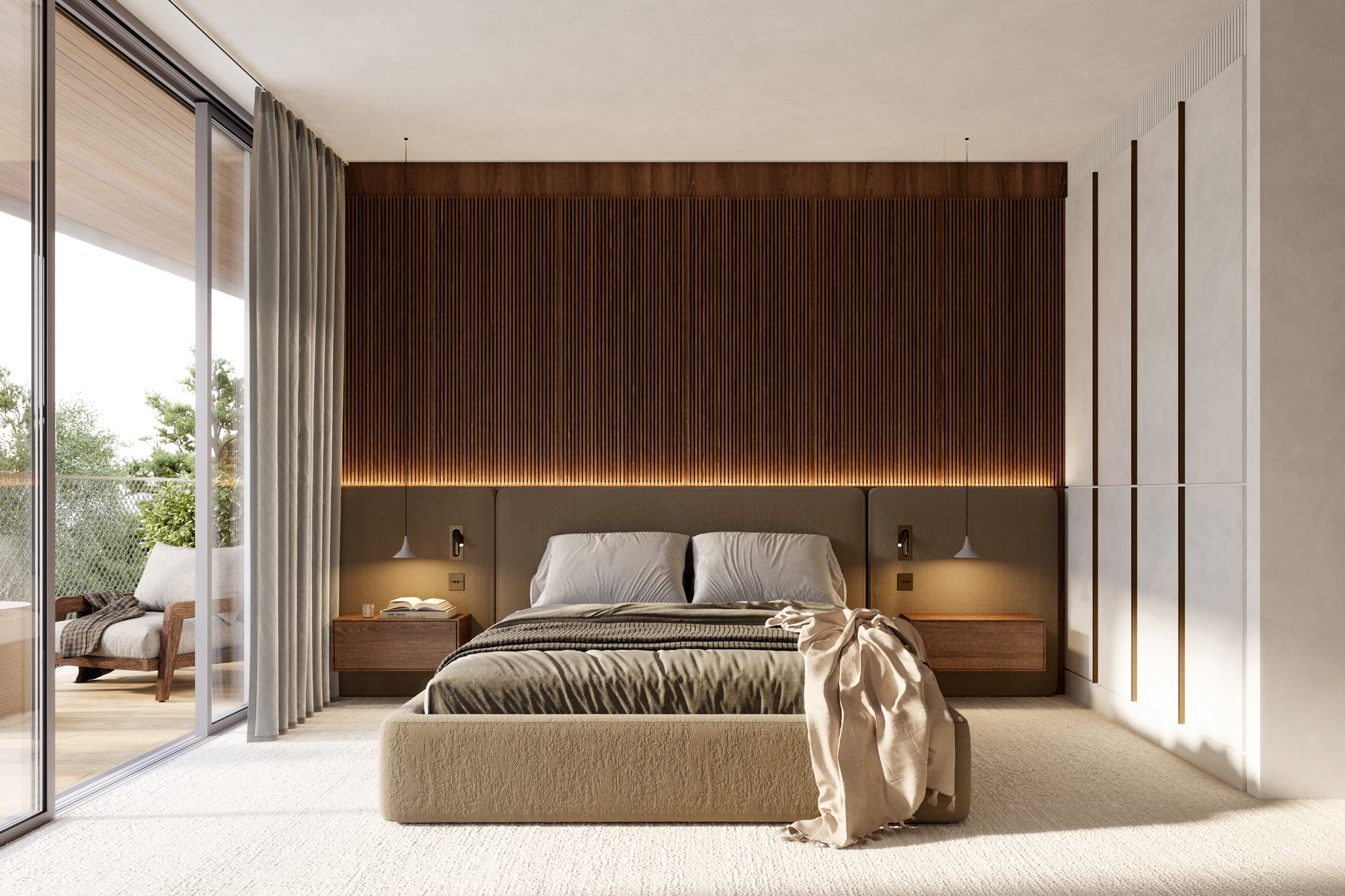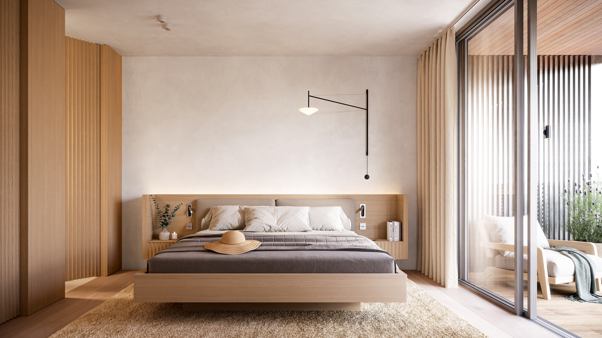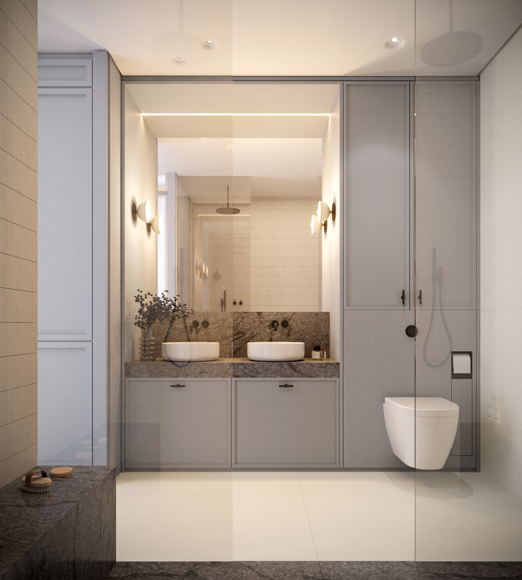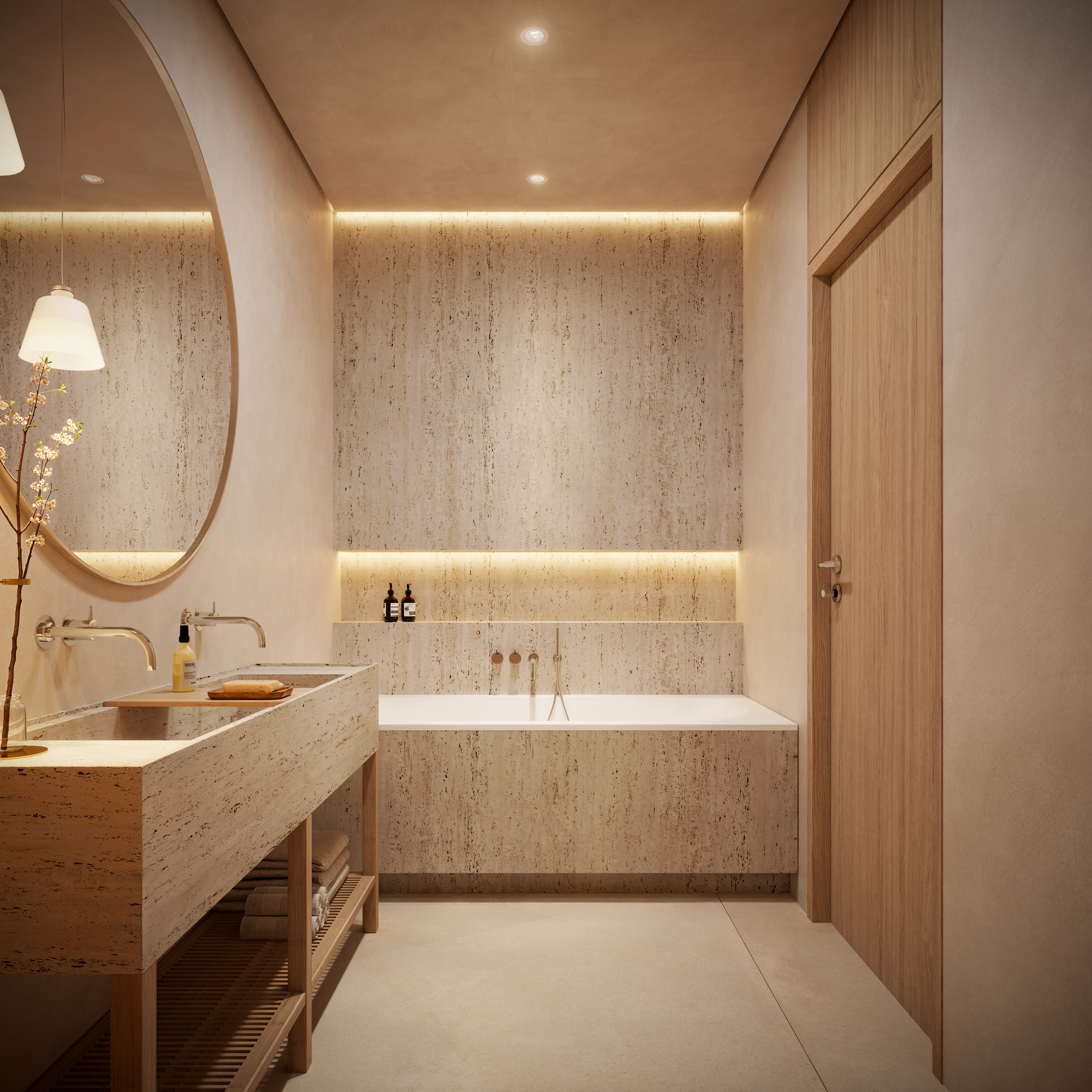 Aranżacja oparta jest na jasnej, stonowanej kolorystyce: łagodne beże, popielate szarości i pastelowe odcienie kolorów ziemi. Odprężenie i spokój.
